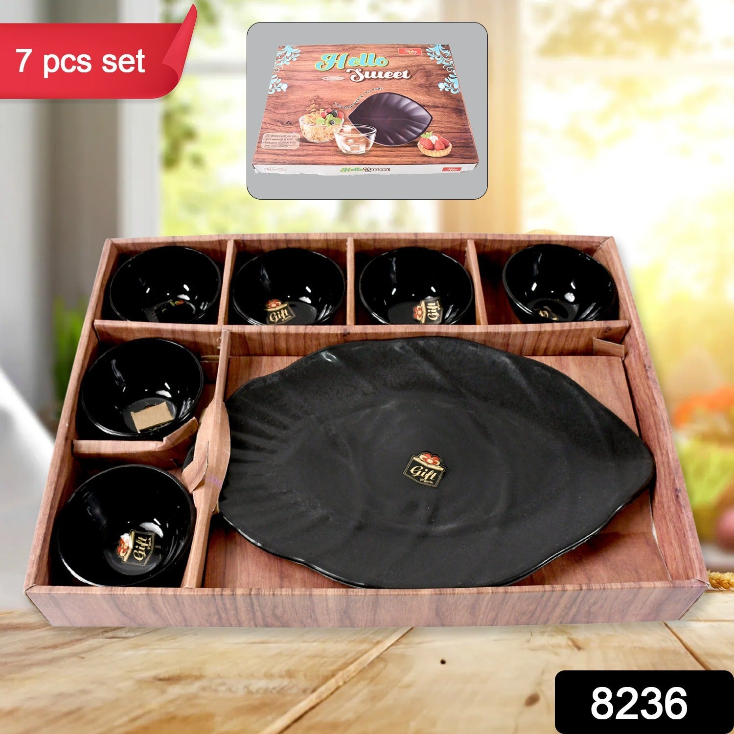 8236 Hello Sweet Round Ceramic Snacks Bowl With Plastic Leaf shape Serving platter Portable, Lightweight Breakfast, Serving Bowl | Ideal for Rice, Pasta, Desserts Home & Kitchen Serving Bowl & platter (7 Pcs set)